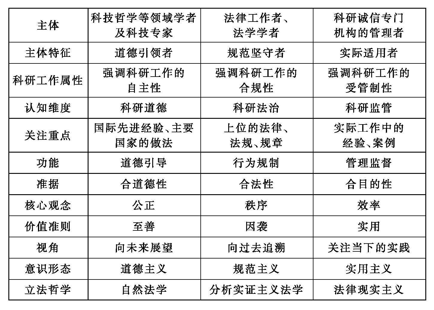 需要审慎地注意:管道化的分析路径可能会抹去不同学科和角色之间在价值准则上一定的共通性。尽管科技哲学、伦理学等领域的学者,以及科技专家处在科研道德-至善-自然法学的进路上无可厚非,但是政策学、管理学、教育学等领域的学者也会考虑监管和教育的现实可能性,在科研监管-实用-法律现实主义的进路上亦可能有所涉入。此外,公共政策学、管理学领域也可能会将法律法规作为主要政策、管理手段之一,以分析实证主义的进路去实现科研法治。法学学者及法律实践工作者的工具角色可能更为明显,在咨询过程中很可能表现出更强的附属性,所提供的法律服务因此呈现出实用特质。同样,一些科研诚信监督管理者也可能具有理想主义情节,有可能在道德坚守上与科技哲学等领域的学者及科技专家等站在同一战线,并且怀持着严格的依法行政等法治理念。